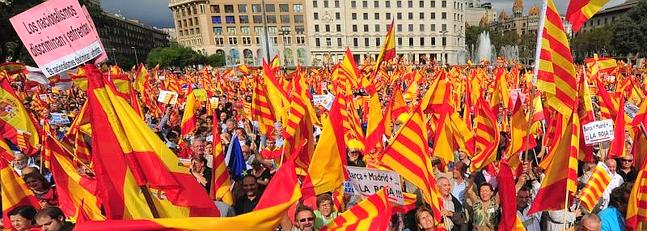 Anti-independentist Catalans hold Catalan and Spanish flags during a