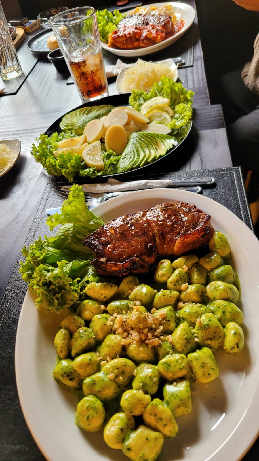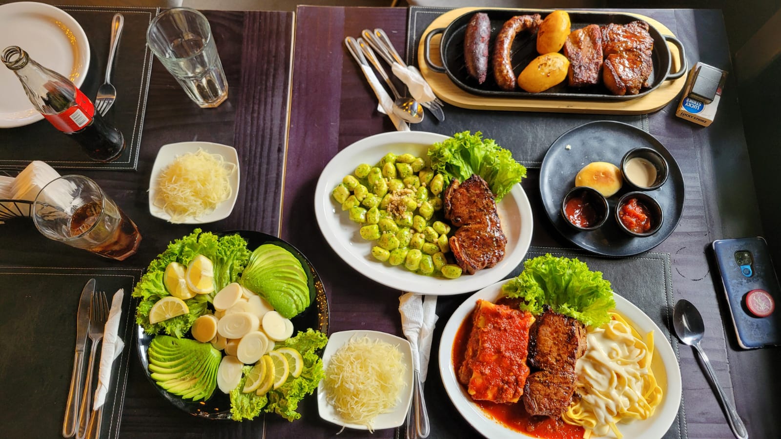 Trilogía Pilpil (entrada), Trilogía Piccola Grillé (lasaña filete fetuccini), Parrillada Individual de Lomo Grillé (chorizo, costillar, pietra, lomo y papas cocidas), Gnocci Pesto Lomo Grillé con ensalada Palmito Palta